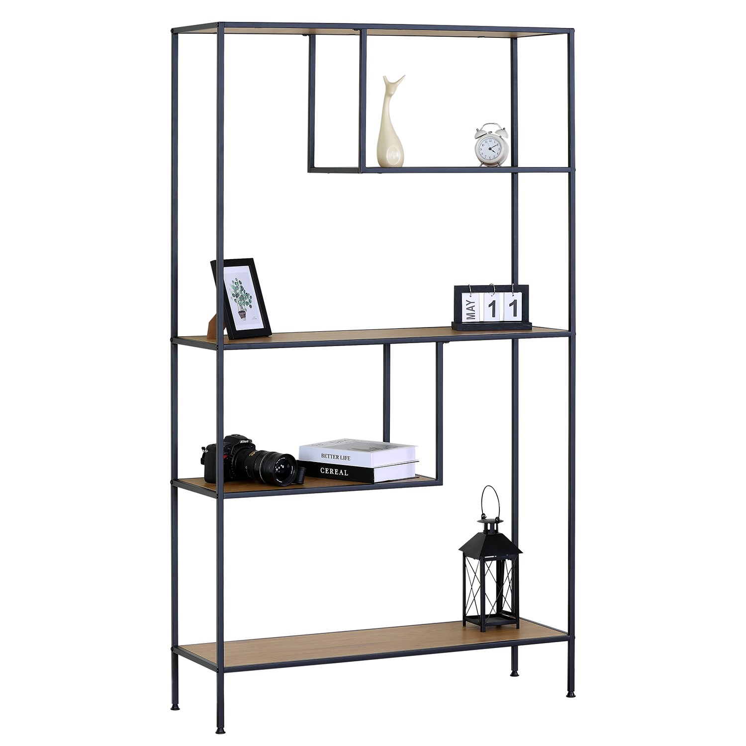- Φινίρισμα δρυός και μαύρο μεταλλικό πλαίσιο