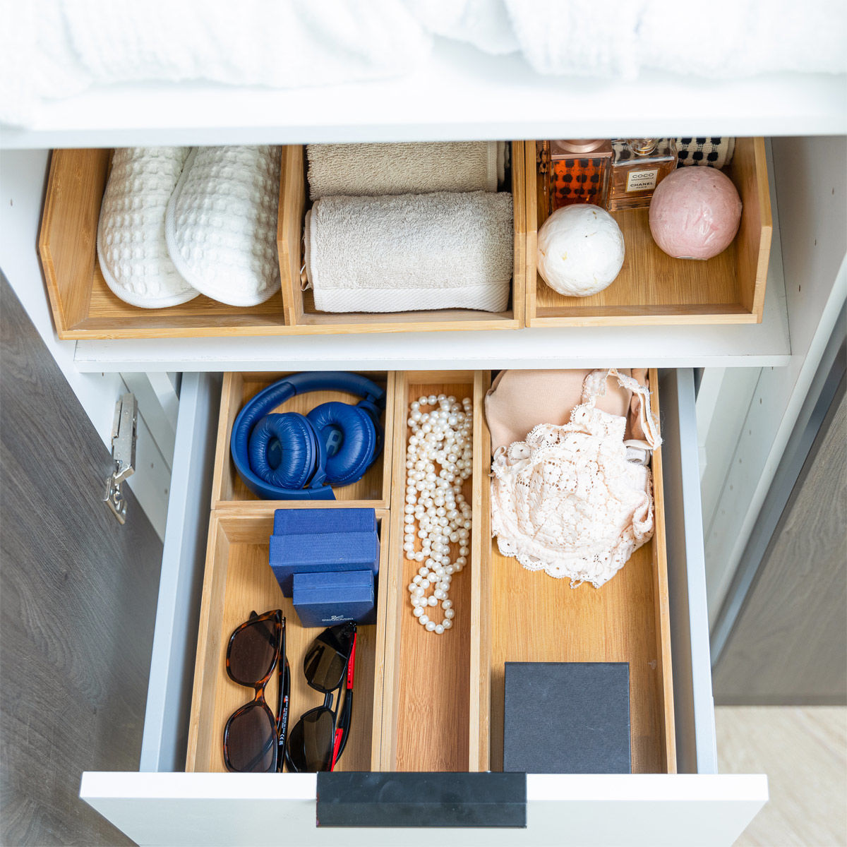 Διατηρήστε την τάξη και την οργάνωση σε κάθε γωνιά του σπιτιού σας με τα κουτιά οργάνωσης συρταριού της σειράς Bamboo Essentials. Οργανώστε τα συρτάρια της κουζίνας, του μπάνιου, του γραφείου ή του μπουντουάρ σας και δημιουργήσετε μια πιο δομημένη και λειτουργική χρήση του χώρου σας.