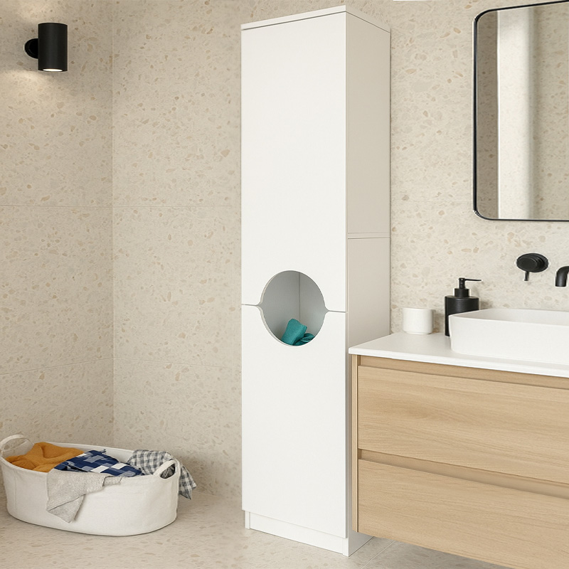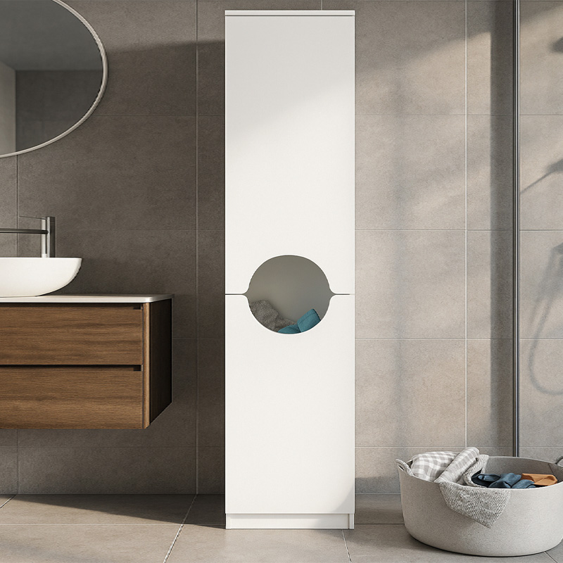 - Διαθέτει ενα ντουλάπι με ράφια και ένα ντουλάπι με καλάθι απλύτων.