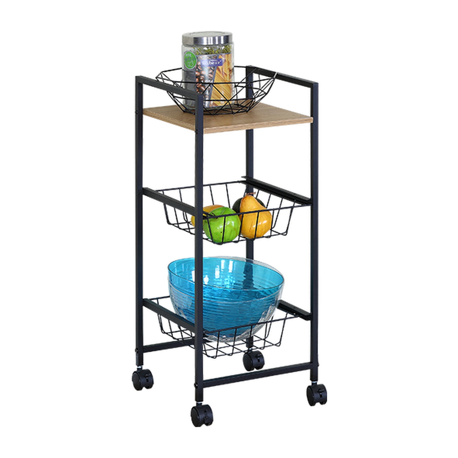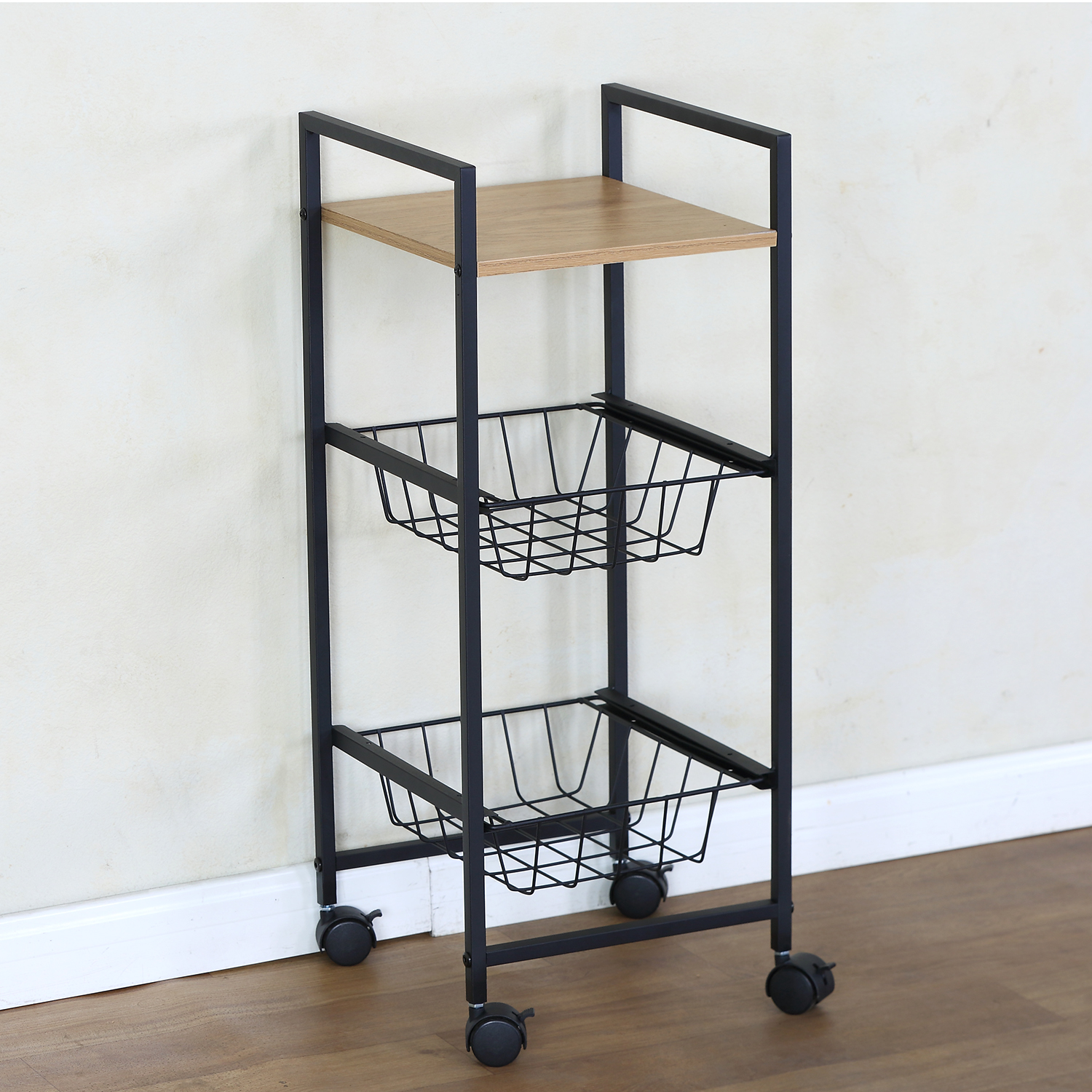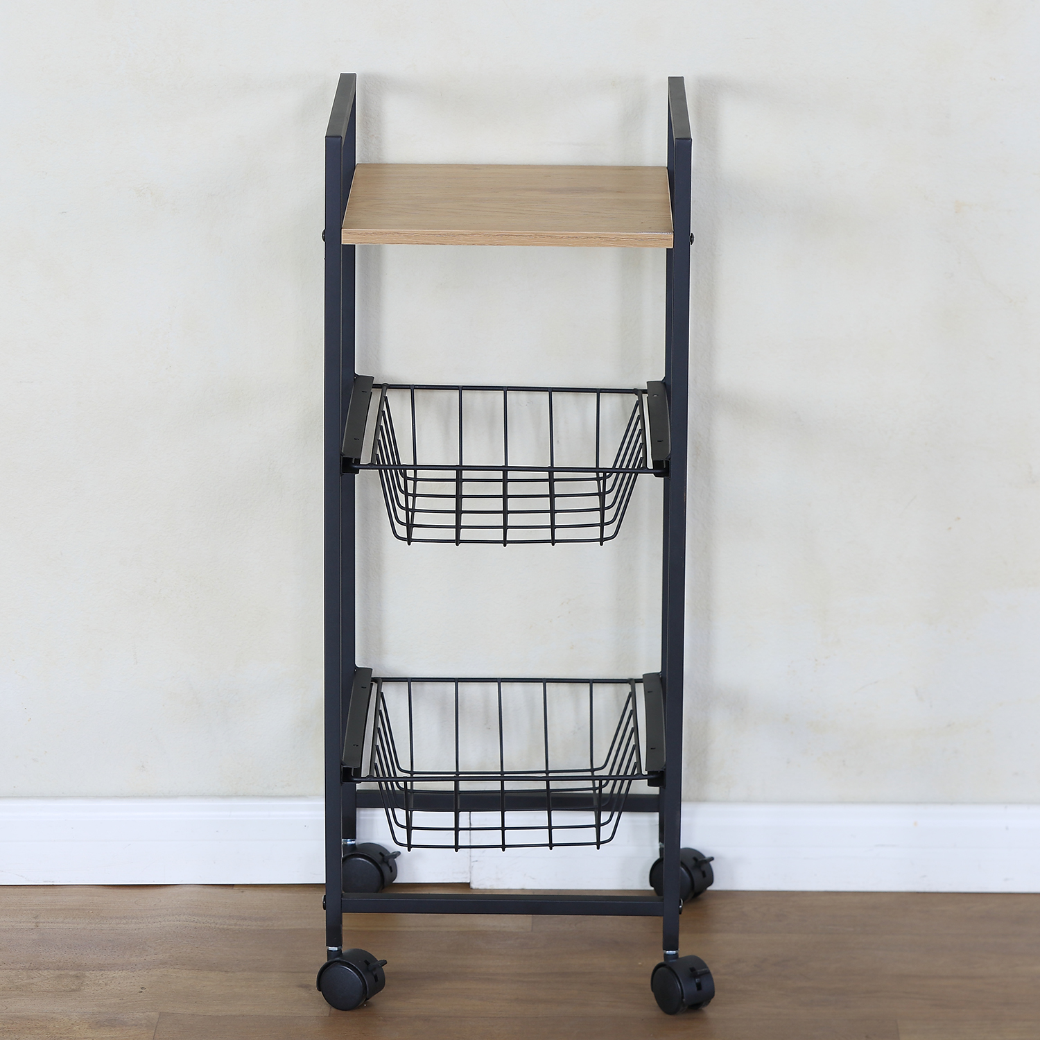 - Φινίρισμα δρυός και μαύρο μεταλλικό πλαίσιο
