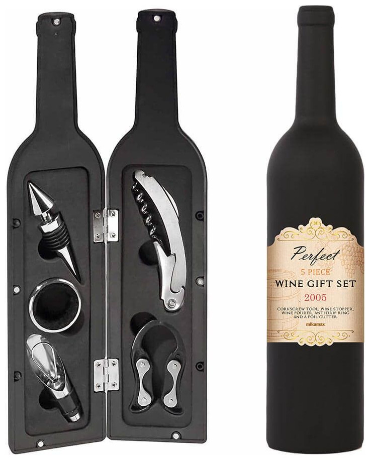 Το σετ δώρου κρασιού είναι το ιδανικό all-in one δώρο για τον οινοπότη. Συνοδεύεται από τιρμπουσόν, πώμα κρασιού, συσκευή χύτευσης κρασιού, δακτύλιο κατά της στάλαξης και κόφτη μεμβράνης. Όλα σε ένα κιτ κρασιού. Εύχρηστος. Παραδίδεται σε κομψή συσκευασία δώρου