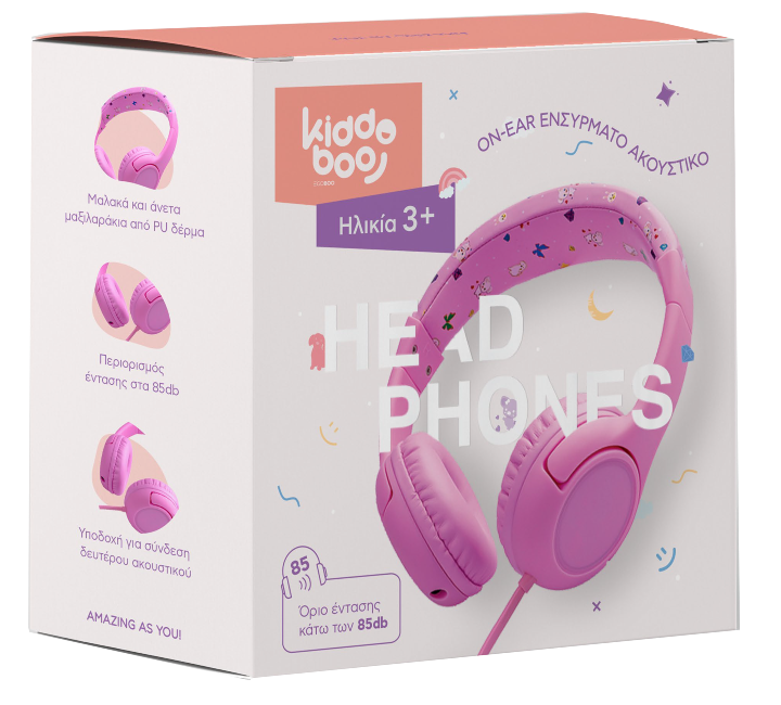 Ειδικά σχεδιασμένο για παιδιά ηλικίας 3 ετών και άνω, τα Kiddoboo ακουστικά προσφέρουν περιορισμό έντασης στα ασφαλή για τα παιδιά επίπεδα των 86dB, διαθέτουν ενσύρματη σύνδεση και υποδοχή για σύνδεση δεύτερου ακουστικού. Με μαλακά και άνετα PU μαξιλαράκια, και δυνατότητα επιλογής μεταξύ δυο χρωμάτων, ροζ και μπλε, αυτό το μοντέλο εξασφαλίζει ταυτόχρονα στυλ και ασφάλεια για τους νεότερους χρήστες.