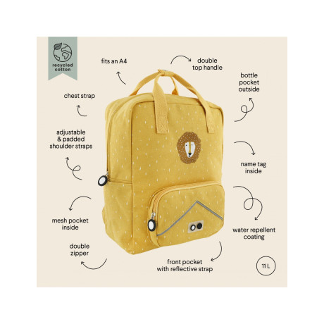 Πάμε, ήρθε η ώρα να ξεκινήσει η μέρα! Αυτό το ευρύχωρο σακίδιο έχει χώρο για όλα όσα χρειάζεται το μικρό σας. Είναι αρκετά μεγάλο για βιβλία και αρχεία Α4, με επενδεδυμένο εργονομικό πίσω πλαίσιο, ρυθμιζόμενους ιμάντες ώμου και ιμάντα στο στήθος για άνετη χρήση. Τα προσεγμένα μικρά χαρακτηριστικά περιλαμβάνουν ετικέτα ονόματος, θήκη Α4 και τσέπη με φερμουάρ στο εσωτερικό. Στο εξωτερικό θα βρείτε μια μπροστινή τσέπη με φερμουάρ, τσέπες σε κάθε πλευρά για μπουκάλια νερού και σνακ, ανακλαστικές λεπτομέρειες για ασφάλεια και επάνω λαβές για εύκολη μεταφορά. Υπάρχει ακόμη και μια μικρή ουρά ζώου στο φερμουάρ για να φέρει ένα χαμόγελο στο πρόσωπο κάθε παιδιού.