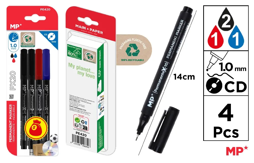Μαρκαδόρος ανεξίτηλος μαύρος,μπλε,κόκκινος για CD-DVD 1mm MP PE420-4COLOR πακ 4 τεμ