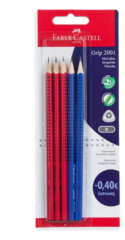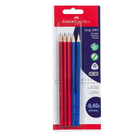 Faber Castell Σετ 5 Μολύβια Grip Με Γόμα B 2001 Κόκκινο + Μπλε 4+1 Δώρο 12157273