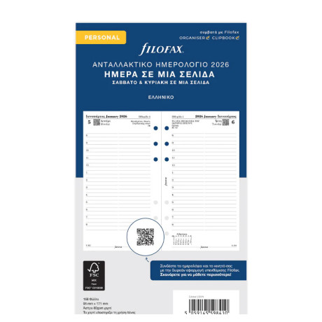 Ανταλλακτικά Φύλλα | Filofax | Personal Ημερολόγιο ημέρα ανα σελίδα με ραντεβού ελληνικό 2026 | 26-68469