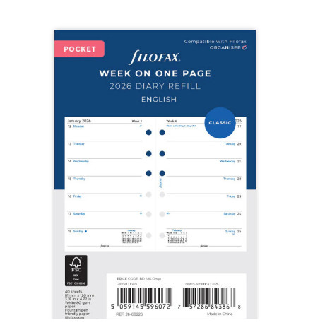 Ανταλλακτικά Φύλλα | Filofax | Pocket Ημερολόγιο Εβδομάδα σε μία σελίδα, Αγγλικό 2026 | 26-68226
