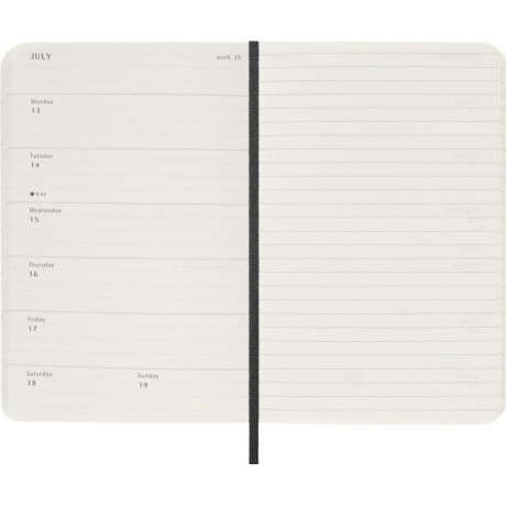 Το κλασικό μαύρο σκληρό εξώφυλλο προσφέρει αντοχή και διαχρονικό στιλ, ενώ η εβδομαδιαία διάταξη σε δύο σελίδες επιτρέπει άμεση καταγραφή ραντεβού, εργασιών και υπενθυμίσεων. Το εκρού acid-free χαρτί της Moleskine εξασφαλίζει άνετη και καθαρή γραφή.