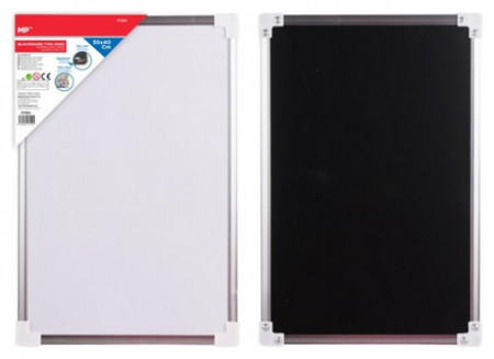 Λευκός πίνακας διπλής όψης: ένας μαγνητικός λευκός για να γράφει με μαρκαδόρους λευκού πίνακα και ένας άλλος μαύρος για να γράφει με κιμωλία. Πλαίσιο αλουμινίου με γωνιακούς θυρίδες για πρόσθετη προστασία. Δεν περιλαμβάνει μαγνήτες, κιμωλία ή μαρκαδόρους. Διαστάσεις: 30x40 cm.