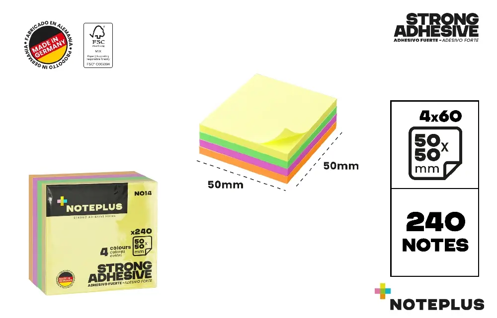 Αυτοκόλλητα Χαρτάκια Σημειώσεων ΔΥΝΑΤΗΣ ΚΟΛΛΑΣ ΝΕΟΝ Κύβος 240φυλλα 50x50mm NOTEPLUS N014