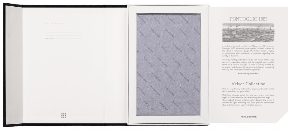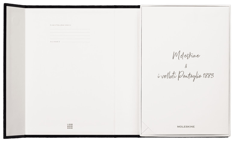 Η Moleskine επιλέγει το βελούδο by Pontoglio 1883 για τη γοητεία και την ήσυχη κομψότητα που αναπνέει σε κάθε σελίδα σε χρώμα ιβουάρ. Αυτό το σημειωματάριο και το κουτί δώρου είναι ντυμένα με ιταλικό βελούδο που γοητεύει το βλέμμα καθώς τραβάει το φως, περικλείοντας τις πιο πολύτιμες χειρόγραφες σημειώσεις σας σε ένα τέλεια βελούδινο εξωτερικό.