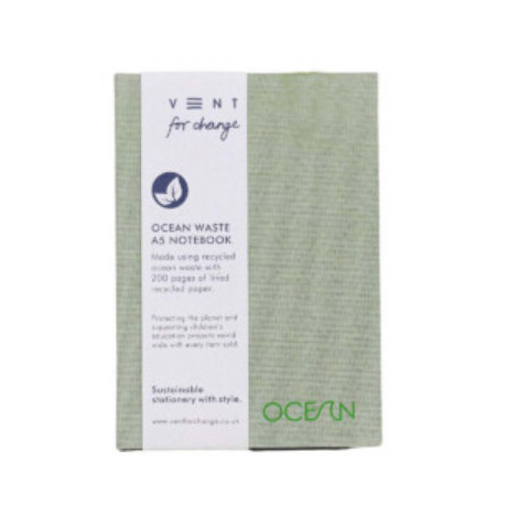 Αυτό το τετράδιο A5 κατασκευάζεται από 55% ανακυκλωμένο πλαστικό από τον ωκεανό και 45% ανακυκλωμένο πλαστικό μετά την κατανάλωση. Το σκληρό εξώφυλλο έχει όμορφο πράσινο χρώμα φύκια, με την λέξη “Ocean” διακριτικά χαραγμένη στο εμπρόσθιο μέρος. Με 200 γραμμωμένες σελίδες από 100% ανακυκλωμένο χαρτί 80gsm, αποτελεί την ιδανική προσθήκη στη συλλογή οικολογικών σας γραφικών ειδών.