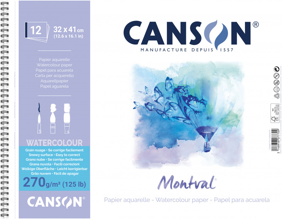 Montval Aquarelle Το χαρτί MONTVAL®σχεδιάστηκε από των ζωγράφο Gaspard Maillol ανιψιό του γλύπτη Aristide Maillol και κατασκευάστηκε από την CANSON® κατόπιν απαίτησης του στις αρχές του 20ου αιώνα. Από τότε το υλικό εξελίχτηκε πάρα πολύ.ACID-FREE , με εξαιρετική διάρκεια ζωής και ειδική επεξεργασία κατά της “μούχλας” χωρίς χημικά λεύκανσης το καθιστούν ένα από τα καλύτερα ποιοτικός υλικά για “Υγρές” τεχνικές για σπουδαστές “Καλών Τεχνών”.Πολύ εύκολο να χρησιμοποιηθεί και να διορθωθεί αφού μπορεί να πλυθεί ακόμα και με βρεγμένο πινέλο .Το παραπάνω υλικό είναι διαθέσιμο με μέτρια υφή (Cold Pressed) ή υφή “χιονιού” (snowy grain), σε ποικιλία φύλλων και μπλοκ.Το MONTVAL® είναι κατάλληλο για όλες τις “Υγρές” τεχνικές όπως Χρώματα νερού, Τέμπερα και Ακρυλικό.
